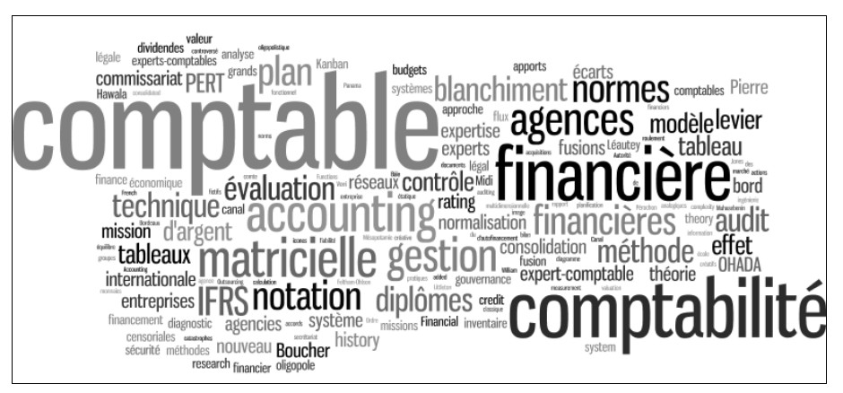 Ce qui frappe dans l'œuvre de Jean-Guy Degos, c'est son éclectisme. Il a soutenu 2 mémoires et 3 thèses de doctorat, tout en menant une carrière de professeur d'économie et gestion (il avait été admis à l'agrégation des techniques économiques de gestion en 1971), qui l'a conduit à créer la section de BTS comptabilité et gestion au Lycée Victor Louis de Talence, en Gironde. Au terme d'un parcours jalonné d'obstacles, il a pu rejoindre l'Université en tant que maître assistant, maître de conférences, puis professeur (émérite) des universités. Il a toujours été opposé au nivellement par le bas, et aux promotions par liste d'aptitude : une promotion par liste d'aptitude, c'est une place de moins aux concours. Et c'est pourquoi il avait été assez meurtri d'être nommé professeur des universités « au 49.3 », après avoir passé l'agrégation de l'enseignement supérieur [2]. Ses deux premières langues vivantes ayant été l'espagnol et le russe, il a appris l'anglais sur le tard ; et son manque de prédispositions pour les mathématiques ne l'a pas empêché de mobiliser les théories les plus en vue à son époque : méthodes matricielles, intelligence artificielle et systèmes experts, fractales, théorie des catastrophes, réseaux neuronaux. On trouvera ci-dessous un nuage [3] de mots qui reflète ce qu'ont pu être ses nombreuses préoccupations...