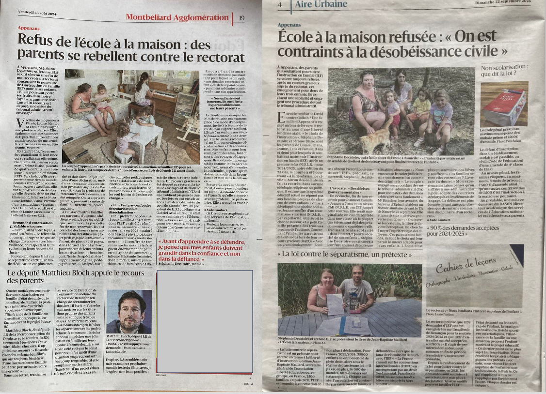Cette année, 2024-2025, l’IEF a été refusée pour leurs deux petits derniers. Après un premier recours auprès de l’académie, ils ont obtenu l’acceptation pour le petit dernier âgé de 4 ans mais pas pour son ainée âgé de 7 ans. Ce refus est d’autant plus étonnant car les tribunaux de Strasbourg et Versailles ont déjà statué contre l’éclatement de la fratrie, ce qui est présentement le cas.