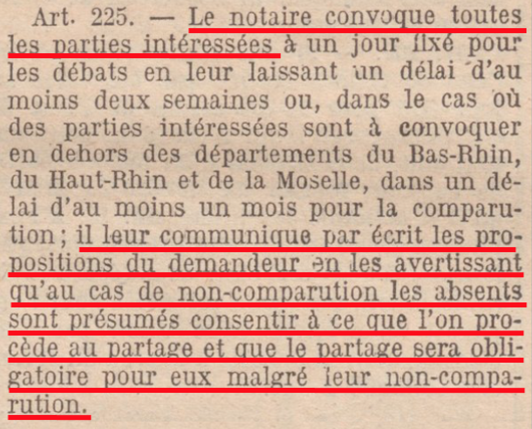 En Alsace-Moselle, la combinaison des procédures notariale et civile s’avèrent scélérates. En effet, la procédure civile est en totale contradiction avec les règles du procès équitable, prévue par la Convention européenne des Droits de l’Homme. La Cour d’Appel de Colmar le confirme en ces termes : « une procédure spéciale qui consiste à arriver à un partage malgré l’absence, l’abstention ou la résistance de la partie intéressée. »