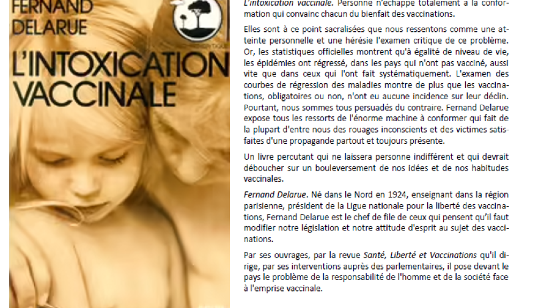 « L'intoxication vaccinale » est le livre qu'a écrit Fernand Delarue en 1977. Il dédia ce livre à ceux qui se sont obstinément refusés à subir le conformisme général et à ceux dont les études et travaux sont étouffés par le mur du silence auxquels il rend hommage.