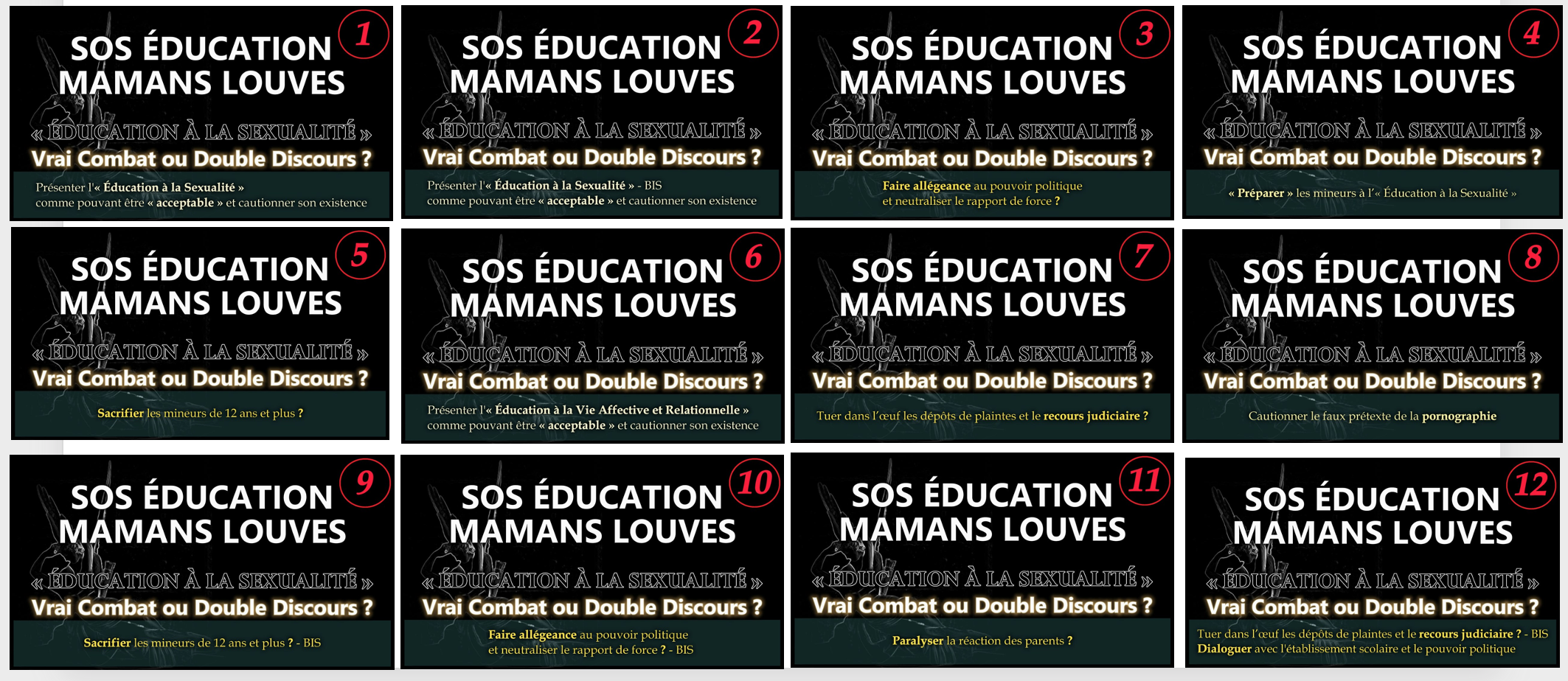 3. Continuer l'exercice engagé par Farida Belghoul en avril 2024, mettant en évidence la duplicité du discours de SOS Éducation dans sa pétition "contre" l'"Éducation à la Sexualité". 3 bis. Identifier et mettre à jour les incohérences et le double discours des associations SOS Éducation et Mamans Louves, dans leurs prises de paroles publiques (médias alternatifs ou subventionnés par l'État), dans leurs textes (pétition, rapport, tweet sur X (twitter)). Ces deux associations sont mises en avant par les médias alternatifs, captent les citoyens résistants, les mènent en douceur et par la duperie, vers l'acceptation de ce à quoi ils s'opposaient, et trahissent leur volonté initiale. Elles dévitalisent le rapport de force : Citoyens versus État.