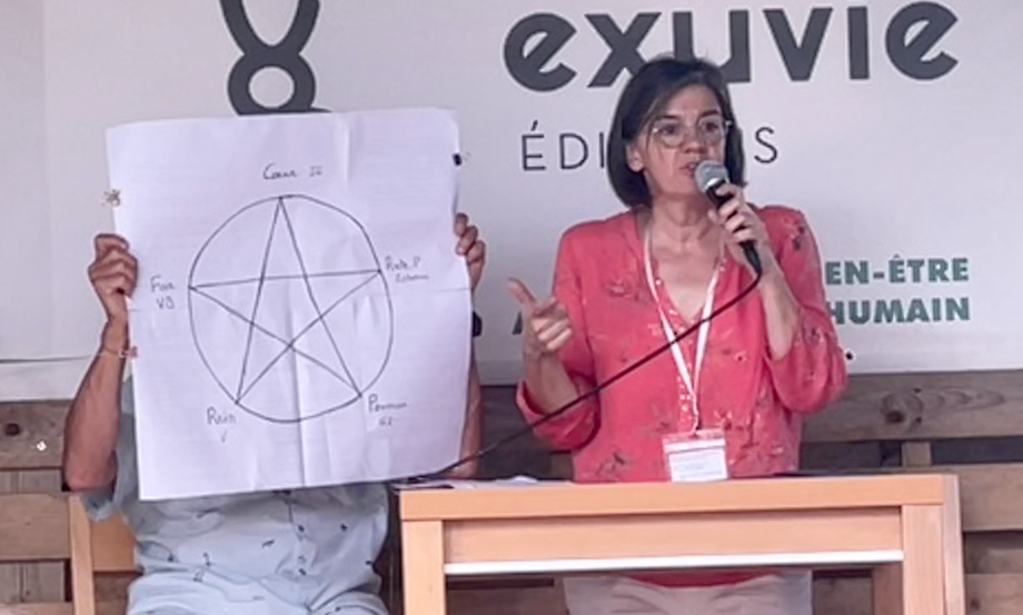 Elle explique comment elle utilise ce schéma pour expliquer la circulation des énergies. Comment un mauvais fonctionnement du foie peut influer sur le cœur, comment la fatigue ou la peur influe sur les reins...