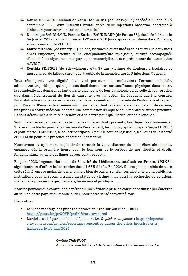 Plusieurs collectifs et associations se sont présentées, Solidekla qui aide les victimes à déclarer leurs effets indésirables, Verity France, les désenfantés qui soutient les parents en deuil, AAvic Team qui vient en aide aux victimes, Viac19 qui a créé une carte de France pour recenser les victimes sur le territoire français. Julia, Cynthia, Karine, Laure, victimes directes de ces injections ainsi que Michèle et Dominique, dont les enfants sont décédés suite à ces injections ont pris la parole. Tous souhaitent que la parole se libère, que les victimes se fassent connaître afin de contraindre les institutions à mettre fin à cette omerta violente et insupportable sur la toxicité de ces injections. Tous appellent chacun de nous à ne plus accepter aucune injection, à parler dans son entourage pour faire connaître la toxicité de ces injections mais aussi tout l'illégalité qui entoure leur mise sur le marché et le crime que représente l'obligation vaccinale.