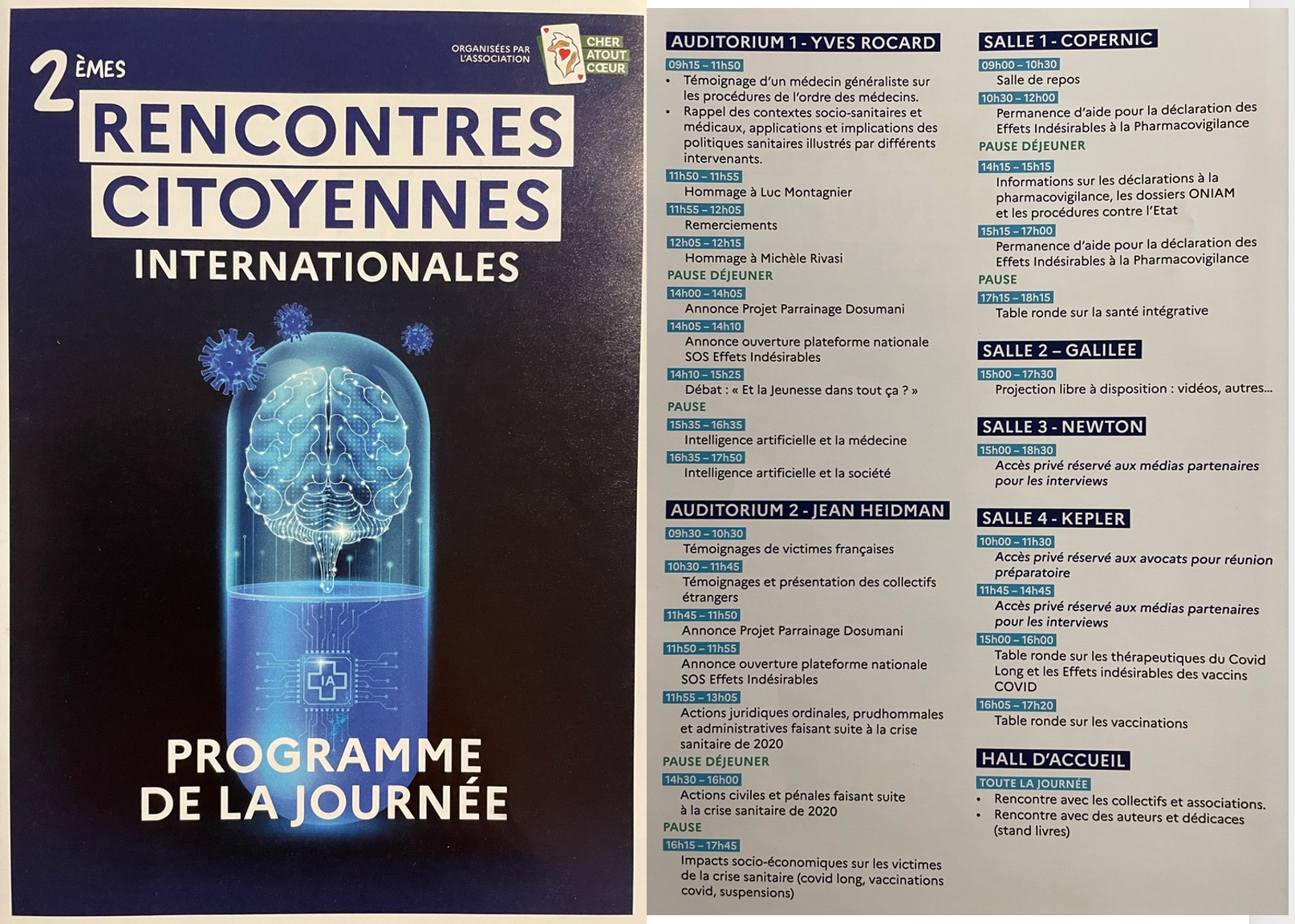 Les objectifs de Cher Atout Cœur étaient globalement les mêmes que l’an dernier concernant les victimes : les soutenir de manière pratique dans les démarches juridiques, leur venir en aide moralement et sur un plan thérapeutique, permettre l’information, la sensibilisation concernant les pathologies liées au Covid long et aux effets non pas indésirables ou secondaires mais bien « primaires », c’est-à-dire attendus et connus des injections expérimentales. Mais aussi donner l’opportunité de la mise en liens des collectifs, associations, victimes, médecins, avocats, thérapeutes et auteurs. Quatre ans après la crise Covid, trop nombreuses sont les souffrances, les errances médicales et l’isolement des victimes.