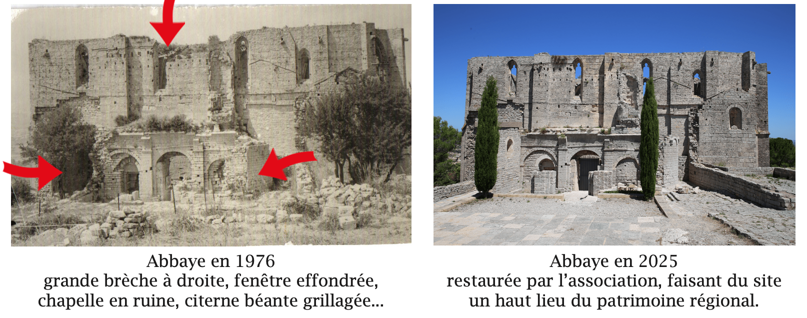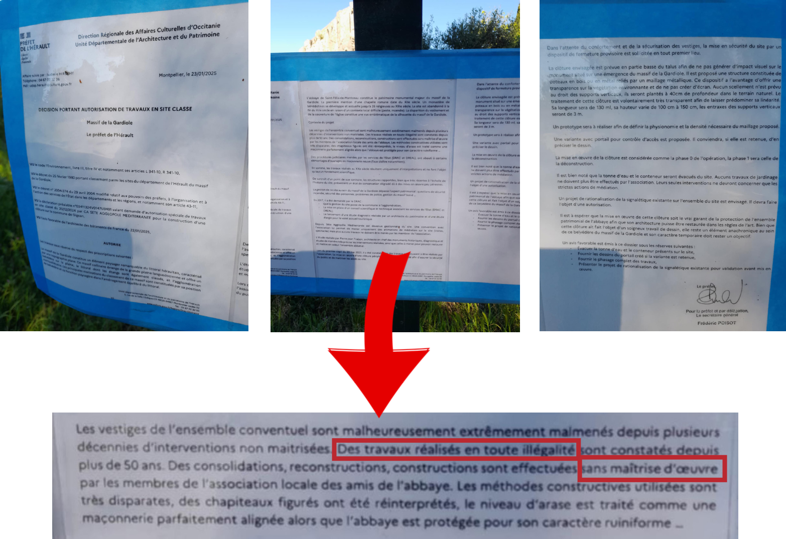 Le rouleau compresseur bureaucratique totalitaire frappe le 23 janvier 2025 sous la forme d’un affichage sur le site. À grands coups de code de l’Environnement, de décret, de déclaration préalable, la « reprise en main » se démasque et assène des coups d’une violence extrême avec des mots : « les vestiges sont malmenés depuis des décennies d’interventions non maîtrisées […] des travaux réalisés en toute illégalité et sans maîtrise d’œuvre […] des chapiteaux figurés ont été réinterprétés […] le caractère ruiniforme n’est pas respecté […] les structures rapportées présentent un état de conservation dégradé dû à des mises en œuvre peu pérennes […] Depuis que Sète Agglopôle a repris le site, la convention passée avec l’association ne serait plus autorisée à mener aucun travaux[…] aucuns travaux de jardinage ne peuvent plus être effectués par l’association […] une clôture qui soit le vrai garant de la protection de l’ensemble patrimonial de l’abbaye afin que son architecture puisse être restaurée dans les règles de l’art. »