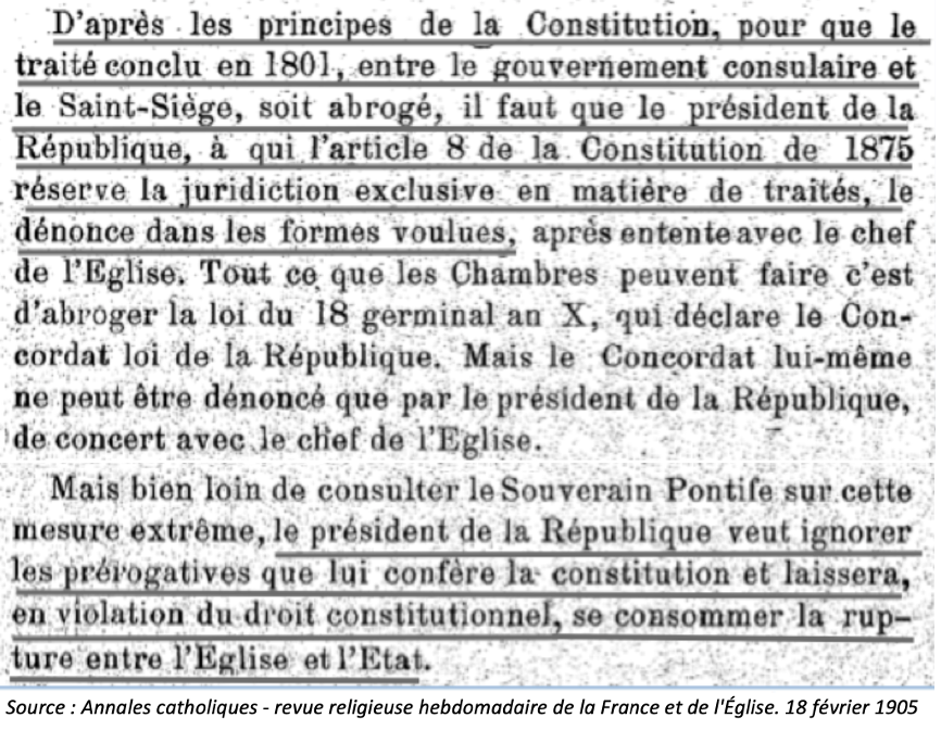 La loi adoptée le 9 décembre 1905 abroge la loi du 18 Germinal An X en France mais, ni le président de la République, ni la France, ni le Saint-Siège ne dénoncent le Concordat.