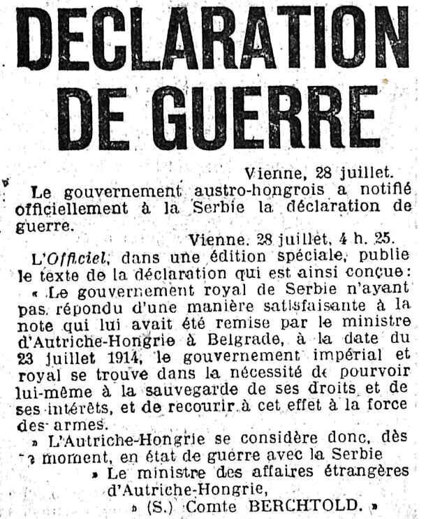 Contrairement à l'article ci-dessus, le gouvernement austro-hongrois ne fera qu'une déclaration d'état de guerre.