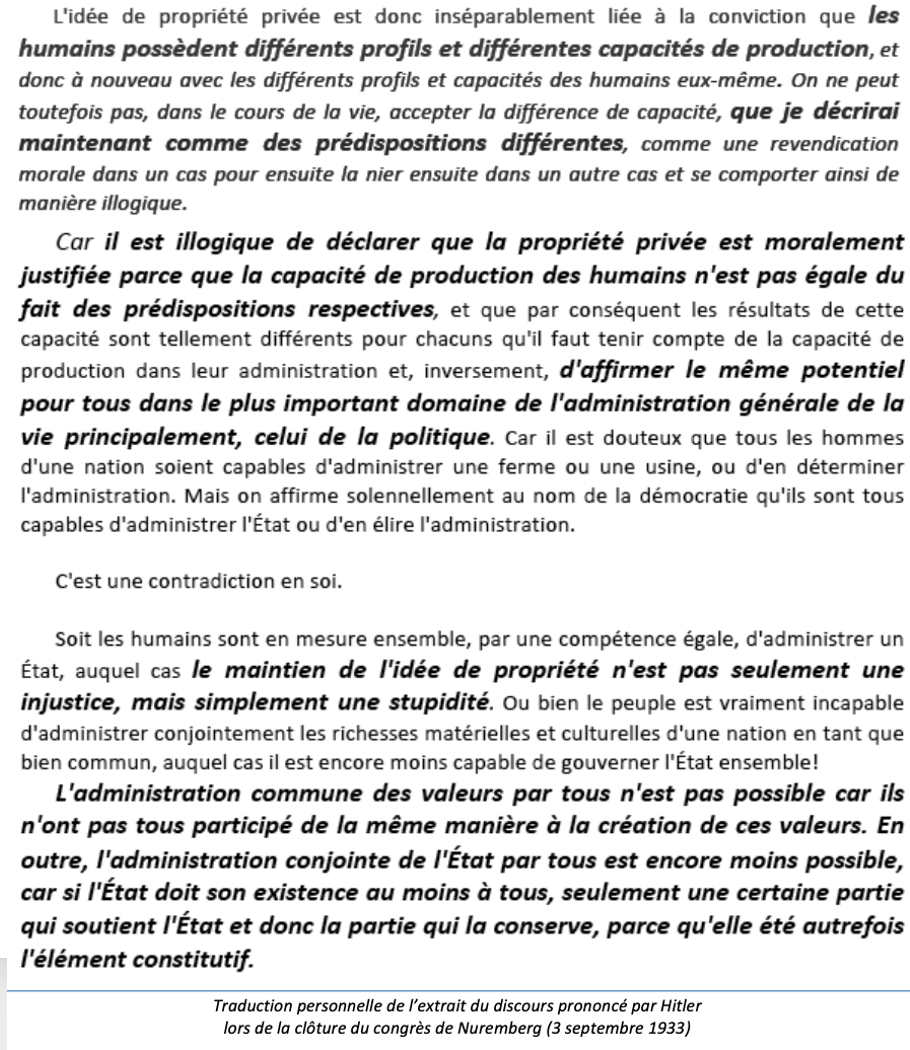 Lors de son discours de clôture du congrès du Parti, Hitler remet en cause la propriété privée au sens que les biens doivent appartenir aux dirigeants.