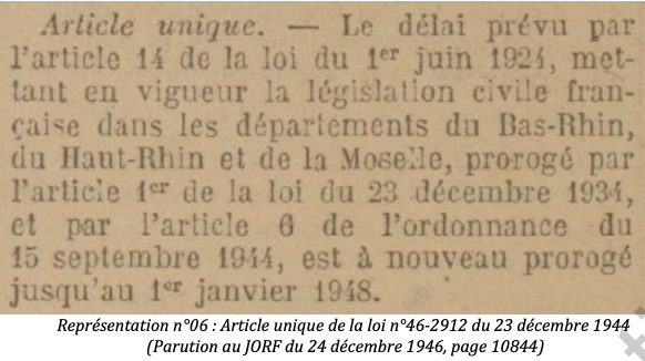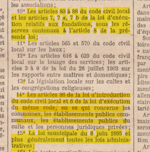 Une partie de la loi civile de 1924, Titre II, art 14, concernant les droits patrimoniaux (foncier, contrats d’assurance, successions, ..) avait été limitée à une durée de 10 ans. Il semble qu’ils espéraient que ces lois seraient transposées en droit français mais cela n’a pas été le cas. Il y a eu plusieurs prorogations votées en France mais toujours rédigées dans les formes respectant la constitution allemande.