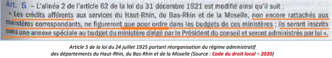 Le Président du Conseil (le 1er ministre français) est en charge, administre, tous les crédits pour l’Alsace Lorraine, ces crédits ne sont inscrits dans les ministères que « pour ordre ».