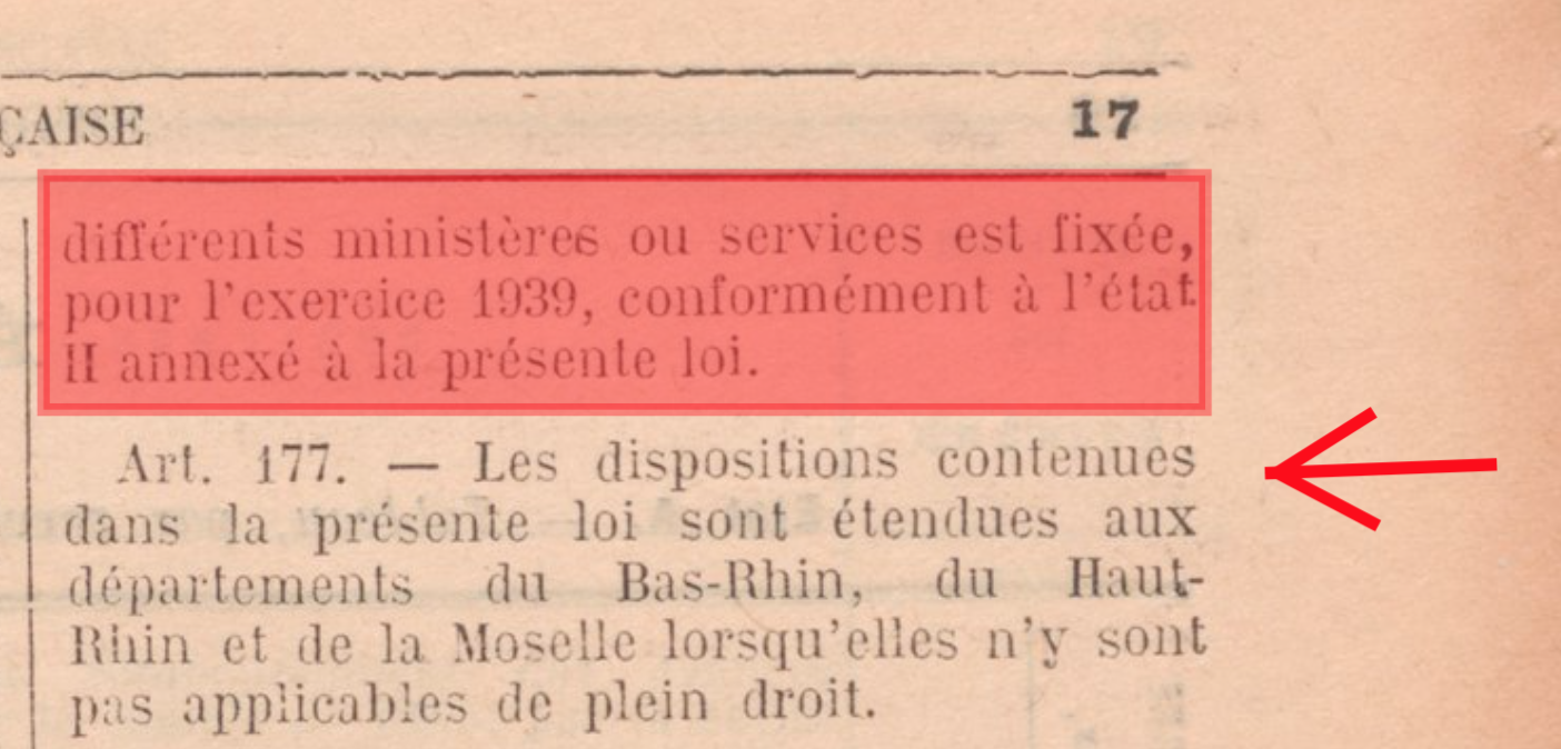 La loi 1939 concernant les finances de l’Alsace Lorraine n’est pas régulièrement publiée puisque le bulletin officiel d’Alsace-Lorraine qui n’a d’officiel que le nom. Le seul bulletin valable est le Gesetzblatt für Elsass-Lothringen mais ce dernier est ignoré par la France bien que le seul valable juridiquement en Alsace Lorraine.