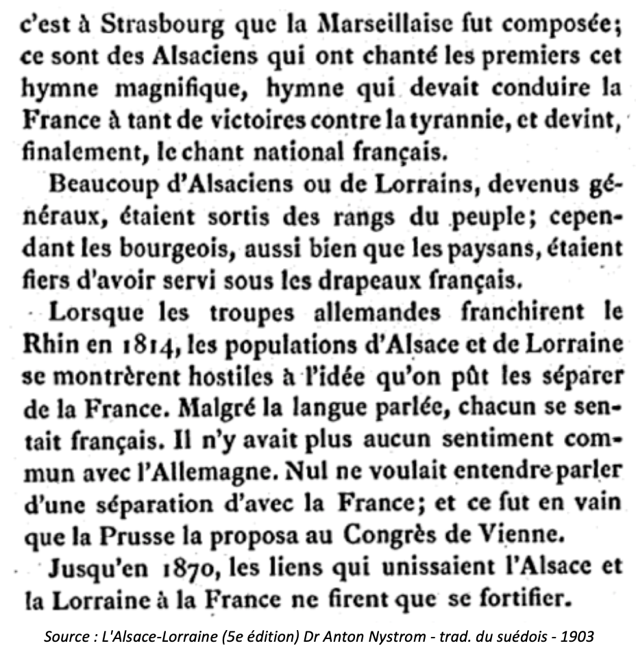 Lors de ce Congrès de Vienne qui mit fin aux guerres napoléoniennes, la Prusse proposa la séparation de l’Alsace-Lorraine à son profit. La population d’Alsace-Lorraine, bien que de langue allemande, revendique se sentir française, se montre hostile à l’idée que l’on puisse la séparer de la France et ne se sent plus aucun sentiment commun avec l’Allemagne.