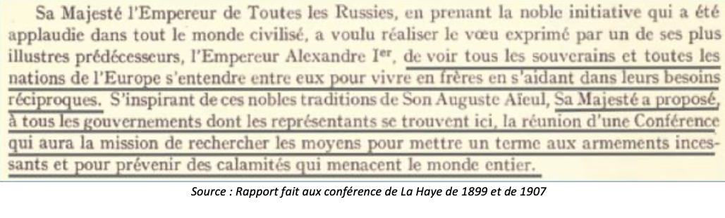 A l’initiative de sa majesté l’Empereur de toutes les Russies, les gouvernements de l’Europe sont appelés à cette conférence du 17 mai 1899, afin de s’entendre entre eux sur les armements et prévenir les conflits armés entre les nations. Ce sont 3 commissions qui traitent du désarmement, des lois de la guerre et de l’arbitrage. C’est une révision des principes élaborés à Bruxelles en 1874.