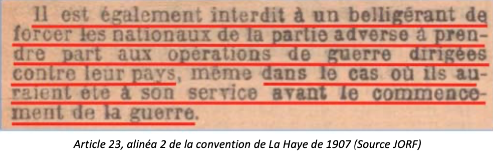 II est important, ici de noter que l’article 44 du Règlement concernant les lois et coutumes de la guerre sur terre (section III) interdit de forcer la population à prendre part aux opérations militaires contre son propre pays.