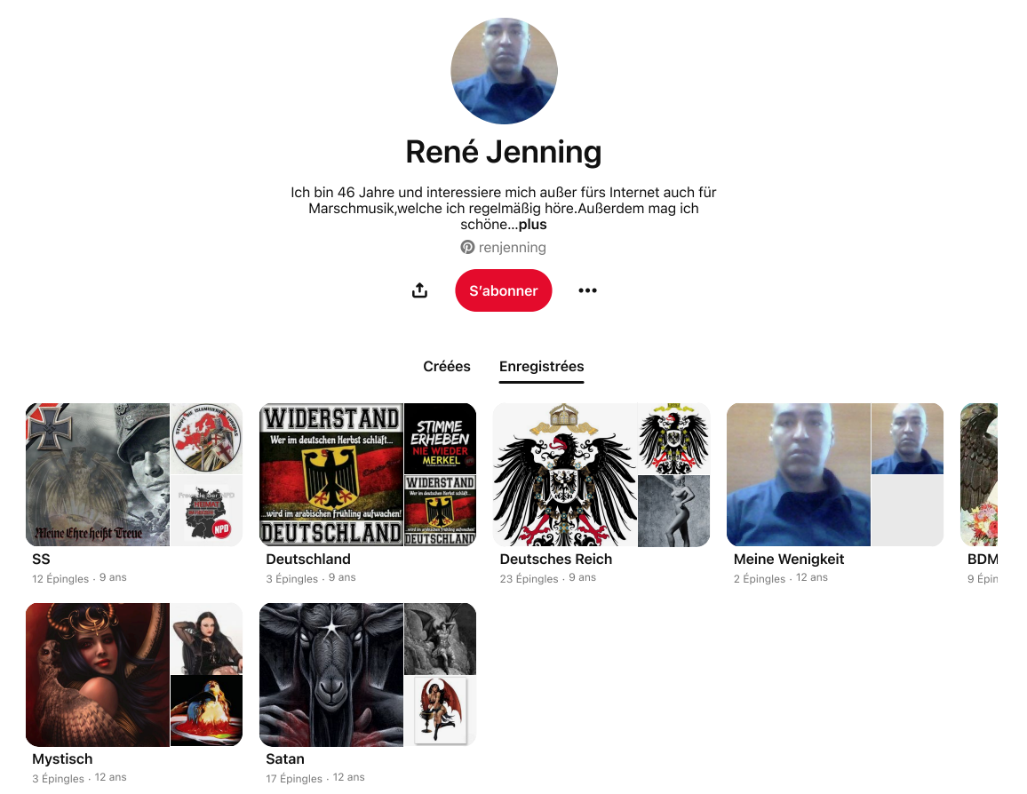 Pour finir, on notera le profil de René Jenning qui a recréé le mouvement « Thule Gesellschaft » en Allemagne, et dont le logo « Nous sommes de nouveau là » ainsi que le profil ne laissent planer aucun doute.