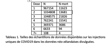 Un lanceur d’alerte néo-zélandais a publié fin octobre 2023 des données sur environ 4 millions d’injections, y compris les dates d’injection et de décès. Ici, les analyses explorent la chronologie des effets de ces injections sur la mortalité toutes causes confondues. Des analyses antérieures sur ce sujet utilisaient des informations hebdomadaires au niveau de la population sur la mortalité toutes causes confondues et les taux d'injection. Les données divulguées en Nouvelle-Zélande permettent un examen des effets des injections au niveau individuel (plutôt qu’au niveau de la population). Le tableau 1 décrit les données disponibles.