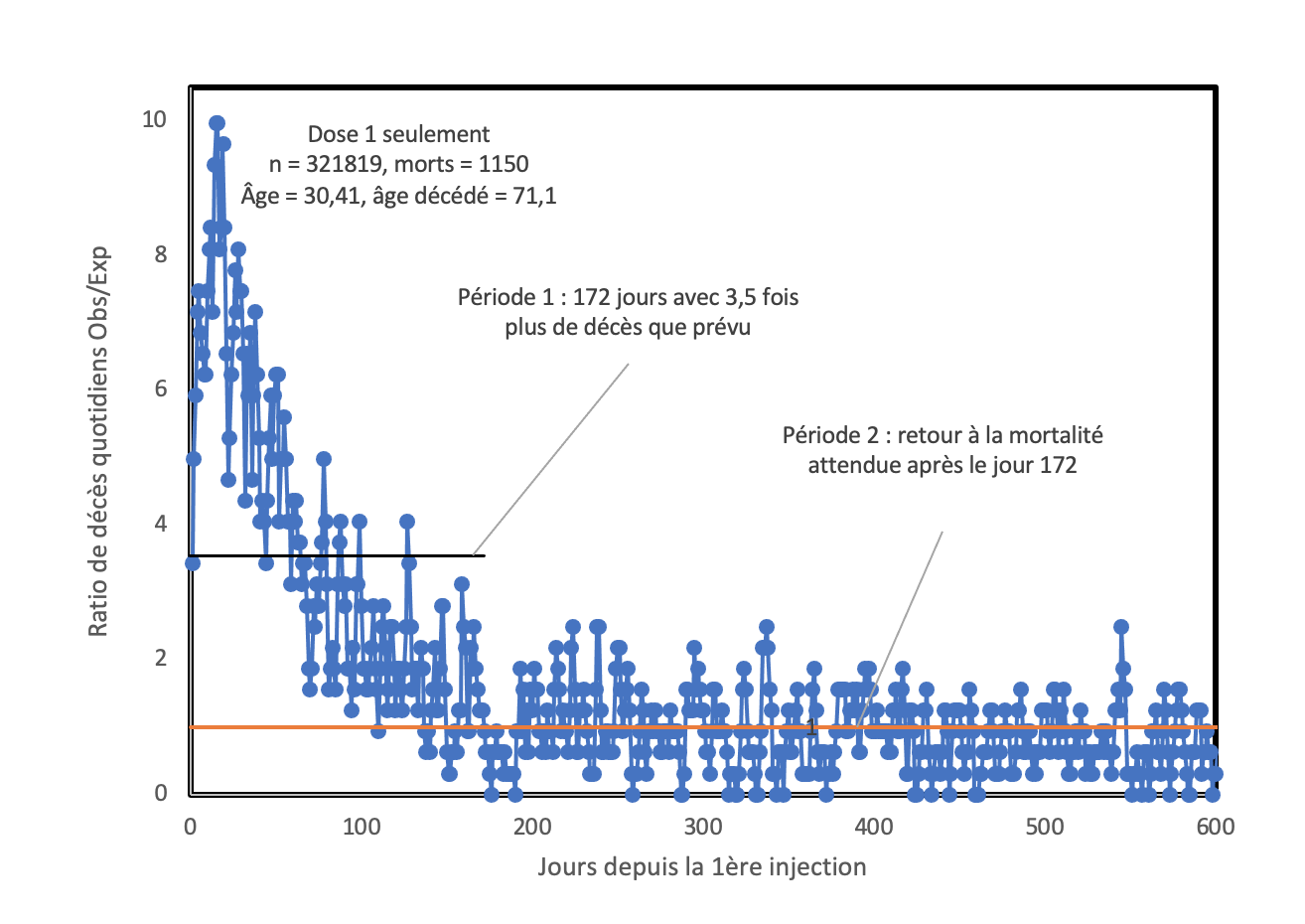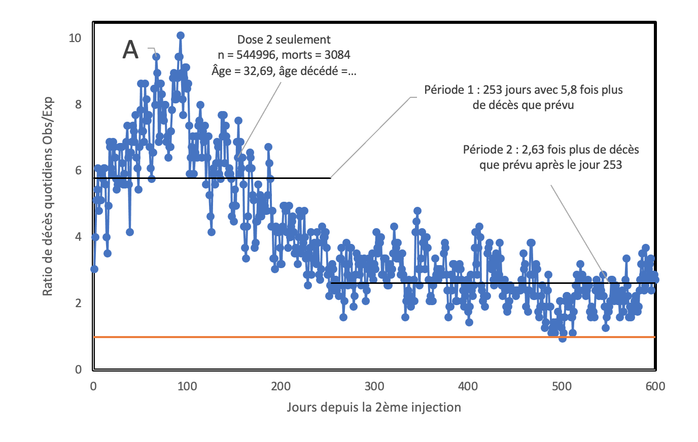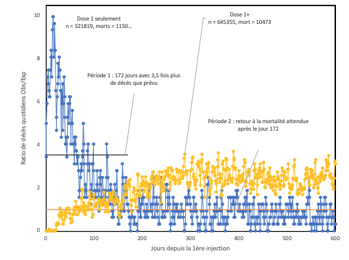 La deuxième période avec des taux journaliers de mortalité stables se caractérise par un retour à la mortalité normale attendue pour les 1ères injections , et une surmortalité journalière stable 2 à 4x. le taux de mortalité normal attendu pour les injections 2-4. Les causes des deux périodes distinctes restent inconnues. La durée de la deuxième période avec des taux de mortalité stables reste inconnue et nécessitera des données similaires pour les périodes ultérieures.