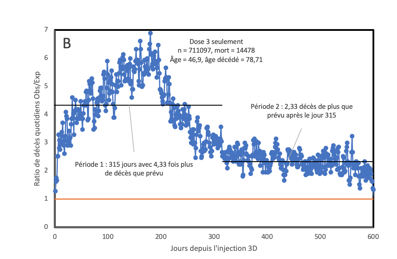 Pour la 2eme période, le ratio entre mortalité observée et attendue se stabilise à 1 pour la 1ère injection (aucune surmortalité), à 2,63 pour la 2ème injection et à 2,33 pour la 3ème injection.