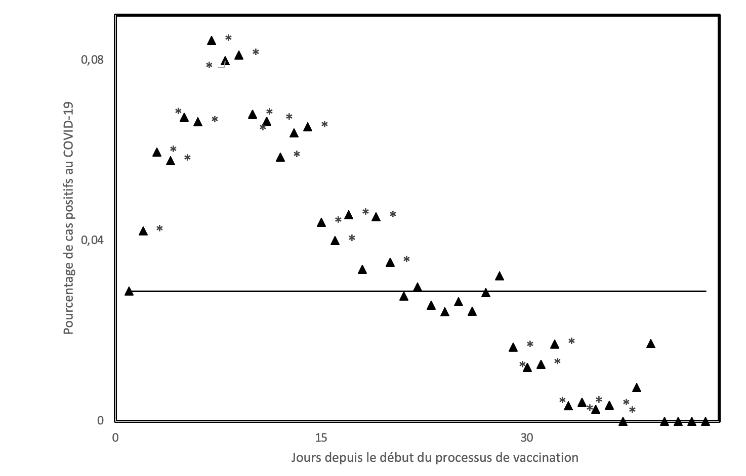 * : P < 0,05 par rapport à la ligne de base. Données du tableau supplémentaire de Dagan et al 2021. Vaccin BNT162b2 à ARNm Covid-19 dans un cadre de vaccination de masse à l'échelle nationale. N Eng J Med 2021 ; 10.1056/NEJMoa2101765.