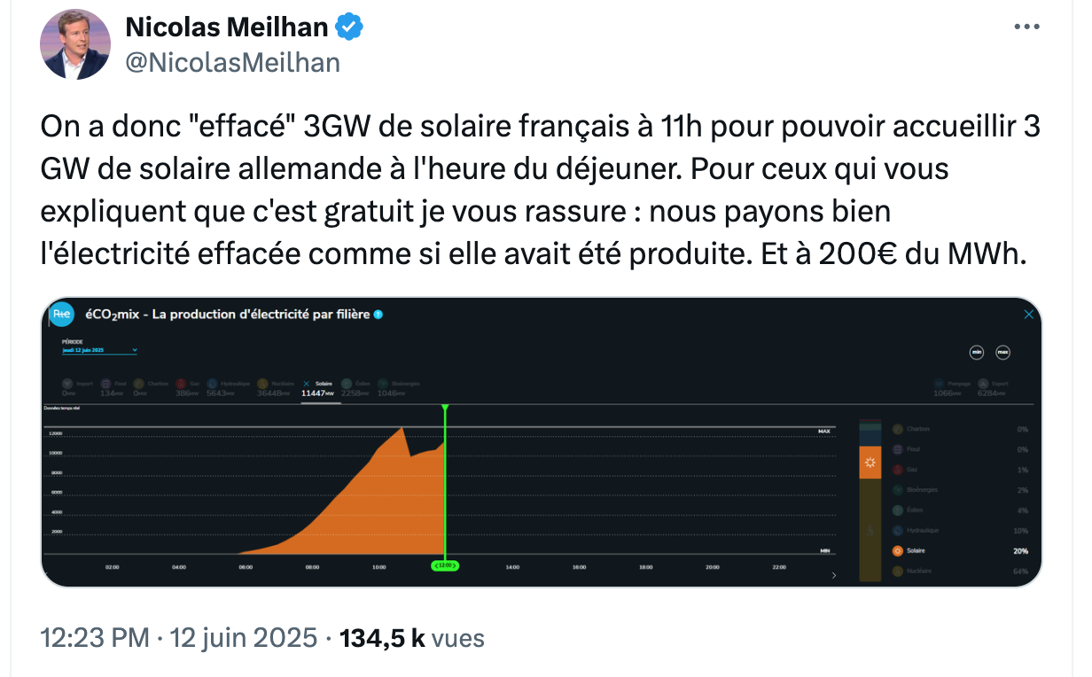 Nicolas Meilhan : "On a effacé ce midi 5 GW de solaire français pour pouvoir accueillir le surplus solaire allemand à l'heure du déjeuner. Mais nous payons bien cette électricité effacée comme si elle avait été produite à 200€ du MWh. Et la PPE3 prévoit un quadruplement du solaire installé #délire"